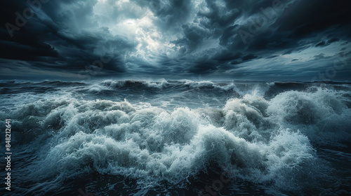 Dramatic stormy seascape with turbulent waves under dark clouds