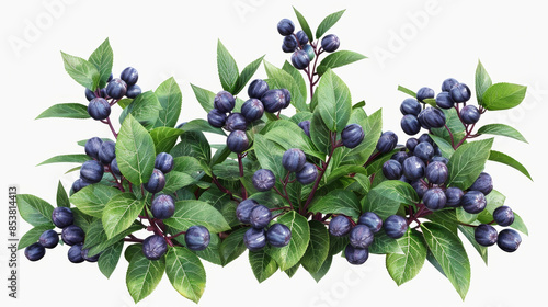 Isolated Aronia melanocarpa shrub with ripe berries on transparent background