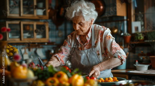 Elderly woman preparing a meal in a cozy kitchen with fresh vegetables