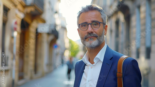 Confident middle-aged man with glasses and beard walking through city street in daylight