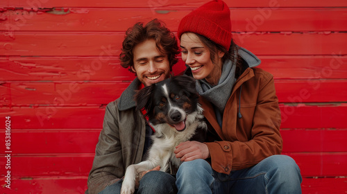 Happy couple sitting with their dog outdoors against a vibrant red wall