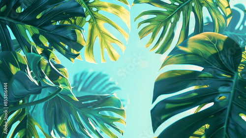 Serene tropical foliage illustration with vibrant green leaves in sunlight