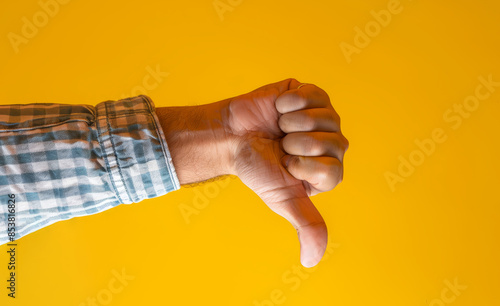 Thumbs down gesture indicating dislike or negative emotion with yellow background