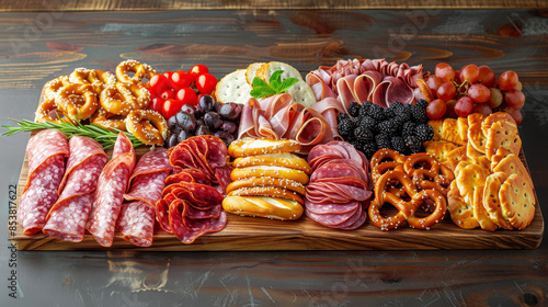 Assorted charcuterie board with pretzels, meats, and fruits on wooden table