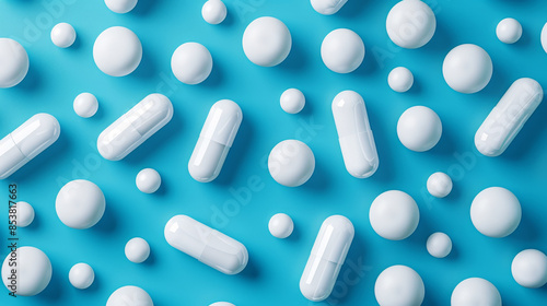 A stack of blue and white capsules on a light blue background