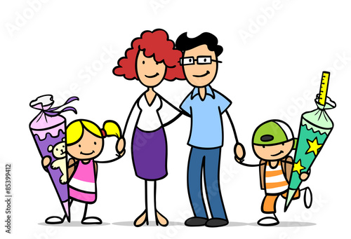 Eltern neben Kind mit Schultüte bei Feier zur Einschulung in Grundschule