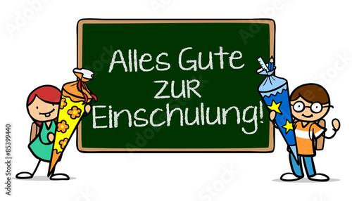 Zwei Kinder mit Schultüte vor leerer Tafel