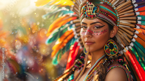 Beautiful woman in traditional Aztec ceremonial attire with colorful feathered headdress