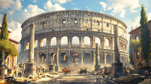Ancient Roman Colosseum with Gladiators and Chariots Amidst Marble Pillars