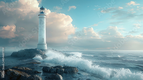 Serene lighthouse overlooking turbulent waves and vast ocean at sunset