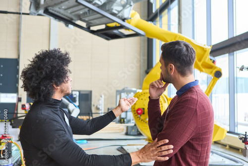 Engineers discussing robotics and automation technologies in modern industrial facility