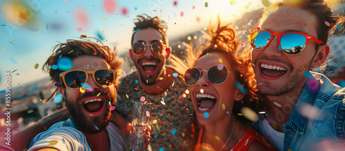 Friends celebrating at a rooftop party with colorful confetti and joyful expressions