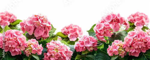 Pink hydrangea flowers on white background showcasing delicate petals and lush green leaves