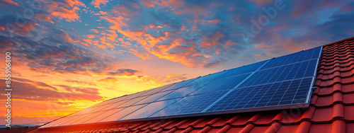 Solar panel on the roof of an urban house at sunset with a vibrant sky