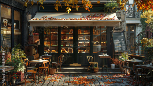 Quaint European cafe with outdoor seating on a cobblestone street in autumn