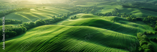 Hyper-realistic aerial view of lush green fields and rolling hills under soft sunlight