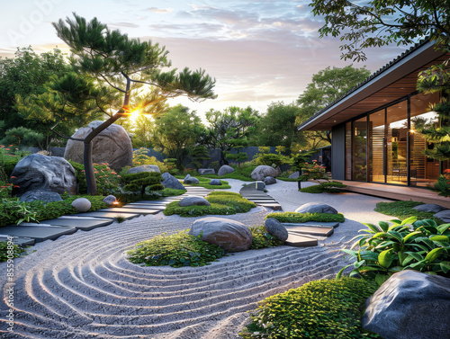 Serene Zen garden with meticulous raked sand and lush greenery at sunrise