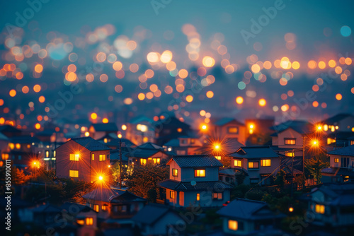 Dreamy nightscape of a Tokyo residential district with vibrant lights and blurred background