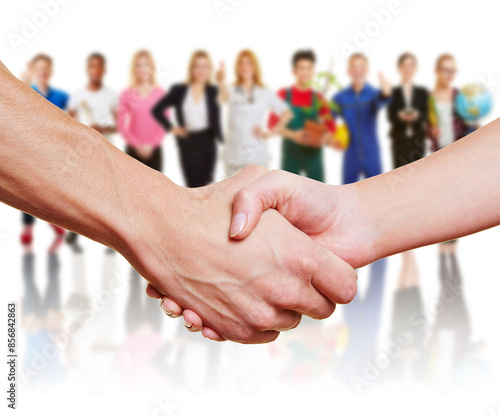 Handschlag vor Mitarbeitern aus vielen Branchen als Karriere Konzept