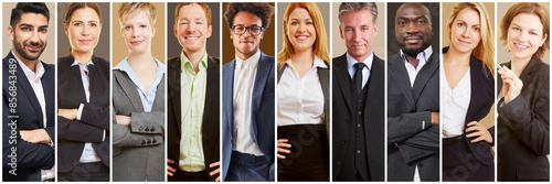 Panorama aus Portraits von Geschäftsleuten vor bunten Hintergründen