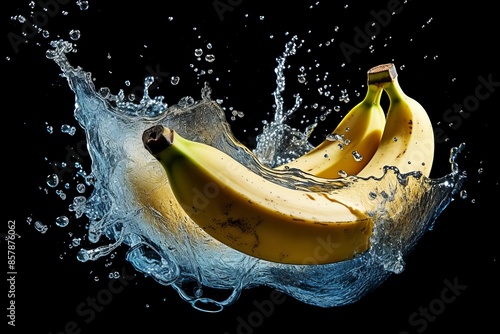 High-quality image showcasing bananas splashing in water against a black background