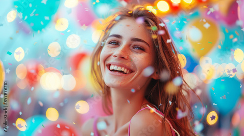 Joyful young woman surrounded by colorful confetti and bokeh lights
