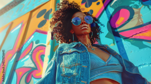 Trendy fashionista in denim jacket against vibrant graffiti art