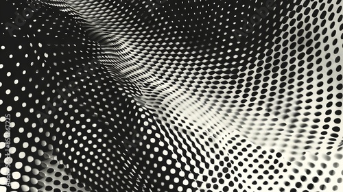 Wavy blue halftone pattern creating a flowing digital landscape with dotted grid on a blue background