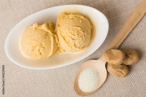 Top view of delicious salted caramel ice cream in a white bowl, perfect for dessert lovers and food photography