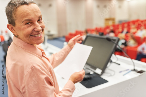 Smiling speaker on stage with document during business event