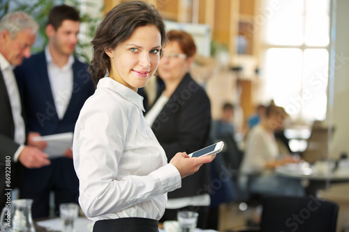 Frau im Büro tippt auf Smartphone