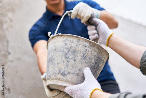 Young male mason coworkers in safety workwear carrying bucket at construction site