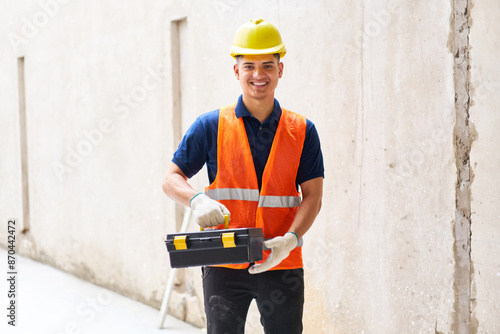 Portrait of smiling young male construction worker wearing workwear holding toolbox at site