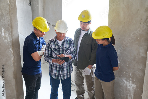High angle view of senior contractor sharing tablet PC with workers while standing together at incomplete corridor