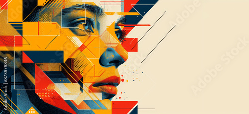 Abstract geometric composition with human face and diverse shapes in vibrant colors