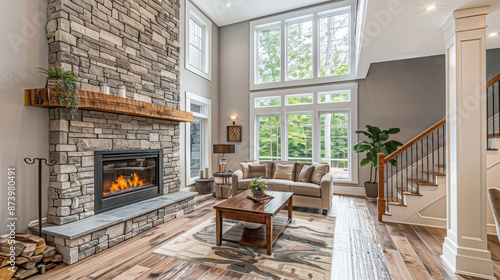 Modern living room with large windows, cozy furniture, and a stone fireplace