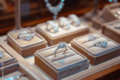 Elegant jewelry store display with diamond rings and necklaces on plush trays