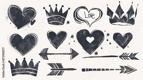 Collection of artistic hand-drawn hearts, crowns, and arrows in black ink style