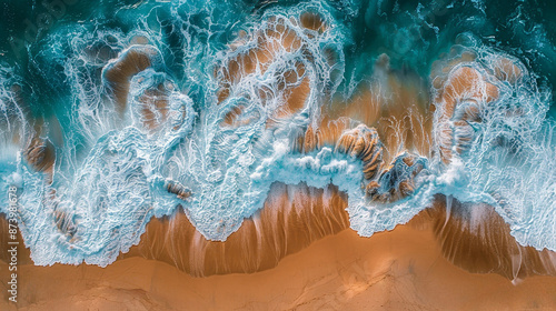 Overhead view of powerful waves crashing against a sandy beach with white foam