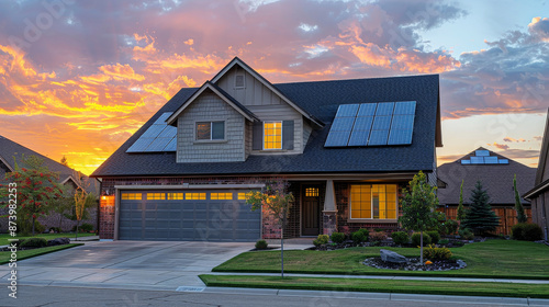 Illustration of modern energy saving detached house with solar panels on roof as green sustainable energy home concept illustration (Generative AI)