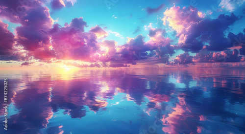 Ethereal digital art of a serene ocean with vibrant sunset clouds reflecting in water