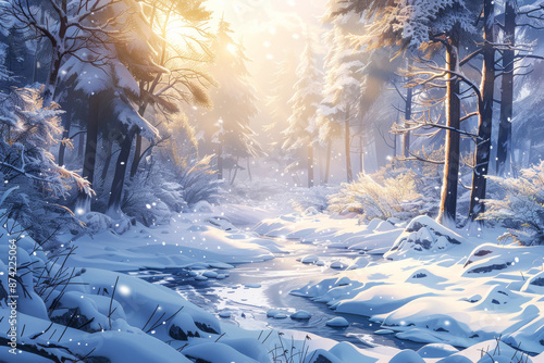 Beautiful winter forest with snow-covered trees and a frozen stream at sunrise