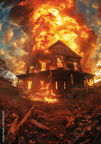 Dramatic fisheye photo of a house engulfed in flames with intense smoke and vivid colors