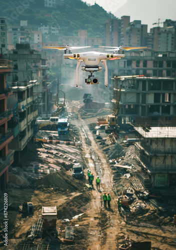 Drone flying over an urban construction site capturing aerial footage of city development