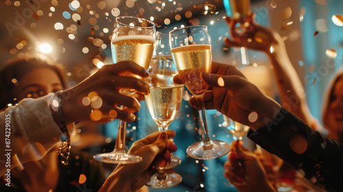 Business celebration with colleagues clinking champagne glasses under confetti