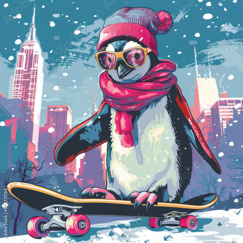 Hipster penguin with sunglasses and scarf holding skateboard in snowy cityscape