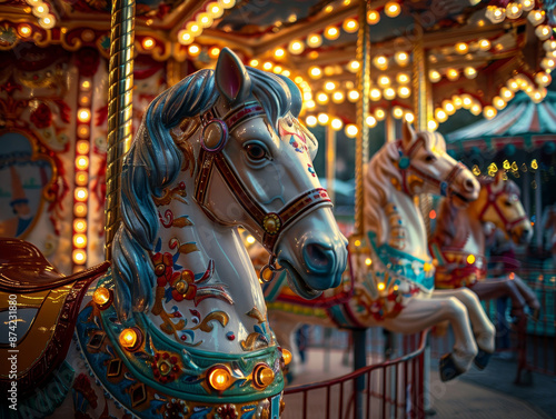 Illuminated carousel horses in a festive amusement park setting