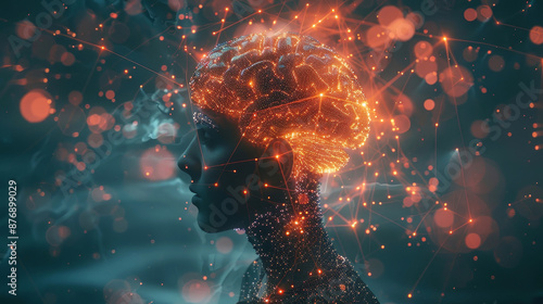 Human silhouette with glowing brain and neural networks in futuristic digital art