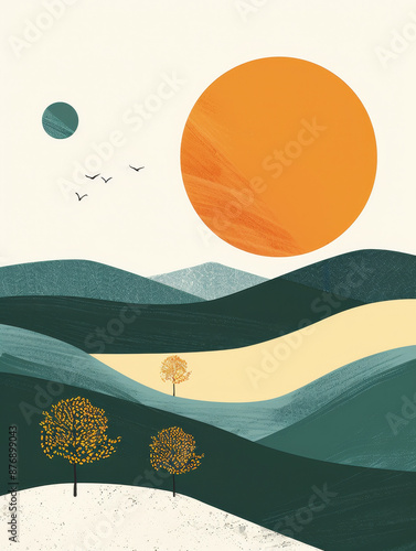 Abstract green landscape wallpaper background illustration design with hills and mountains