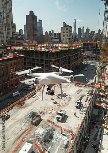 Aerial view of drone flying above a construction site in a bustling cityscape